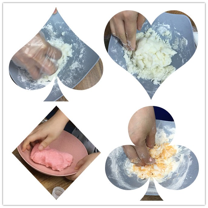 第一步必然要从做冰皮开始,由于大家没经验,开始大家用冷水和粉,后来发现黏稠性一般,问了“度娘”才知道,要用温热水。果真,用了温热水之后,和粉像是开了挂,越来越顺手~